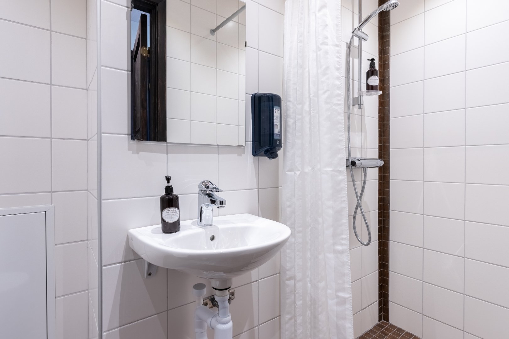 Rummet har ett fräscht badrum med toalett och dusch. Duschtvål och schampo finns på plats, och självklart ingår både handdukar och sängkläder under din vistelse.